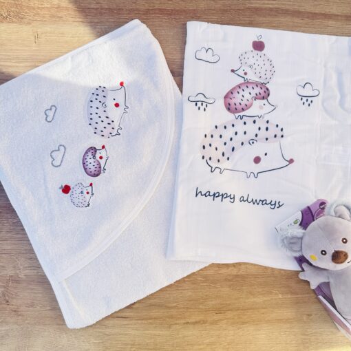 Pour des moments de tendresse et de complicité à la sortie du bain de bébé et en tout moment optez pour cet ensemble composé d’une serviette en éponge ultra absorbante coton de bamboo avec un joli motif assortie a la couverture mousseline toute fonction, Elle permet d’envelopper bébé tout en douceur !