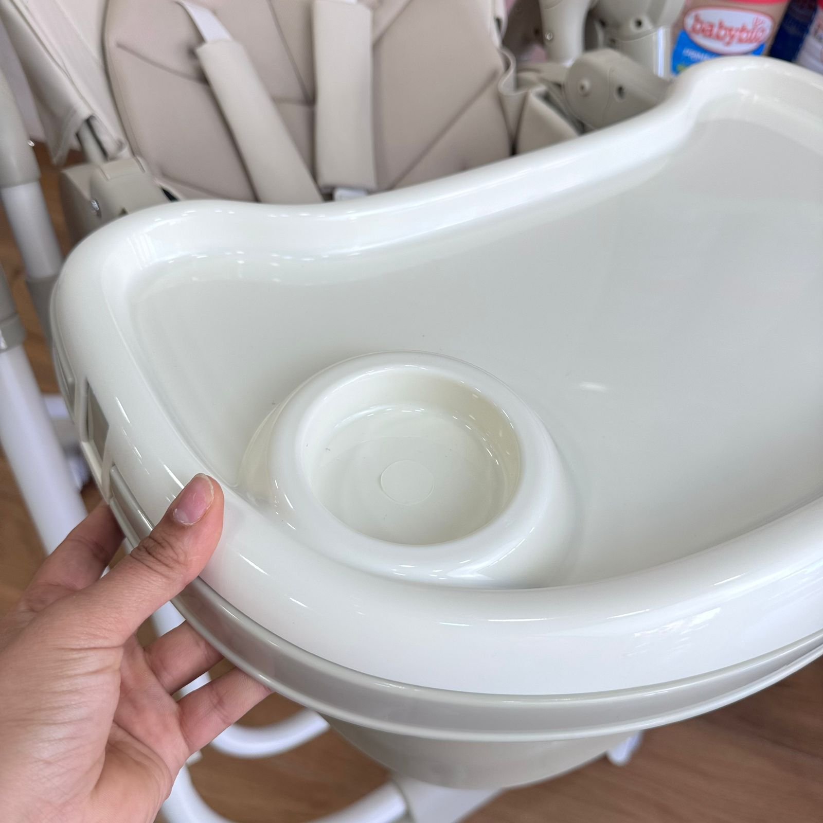 - Contenu : Chaise haute, coussin coton, roulettes, câble USB-C, télécommande, tablette double, manuel