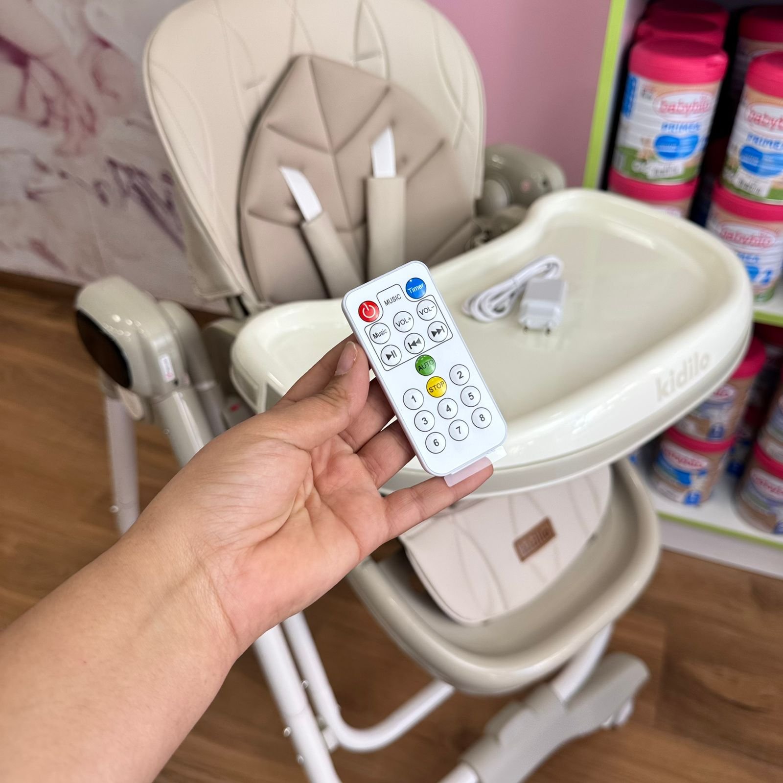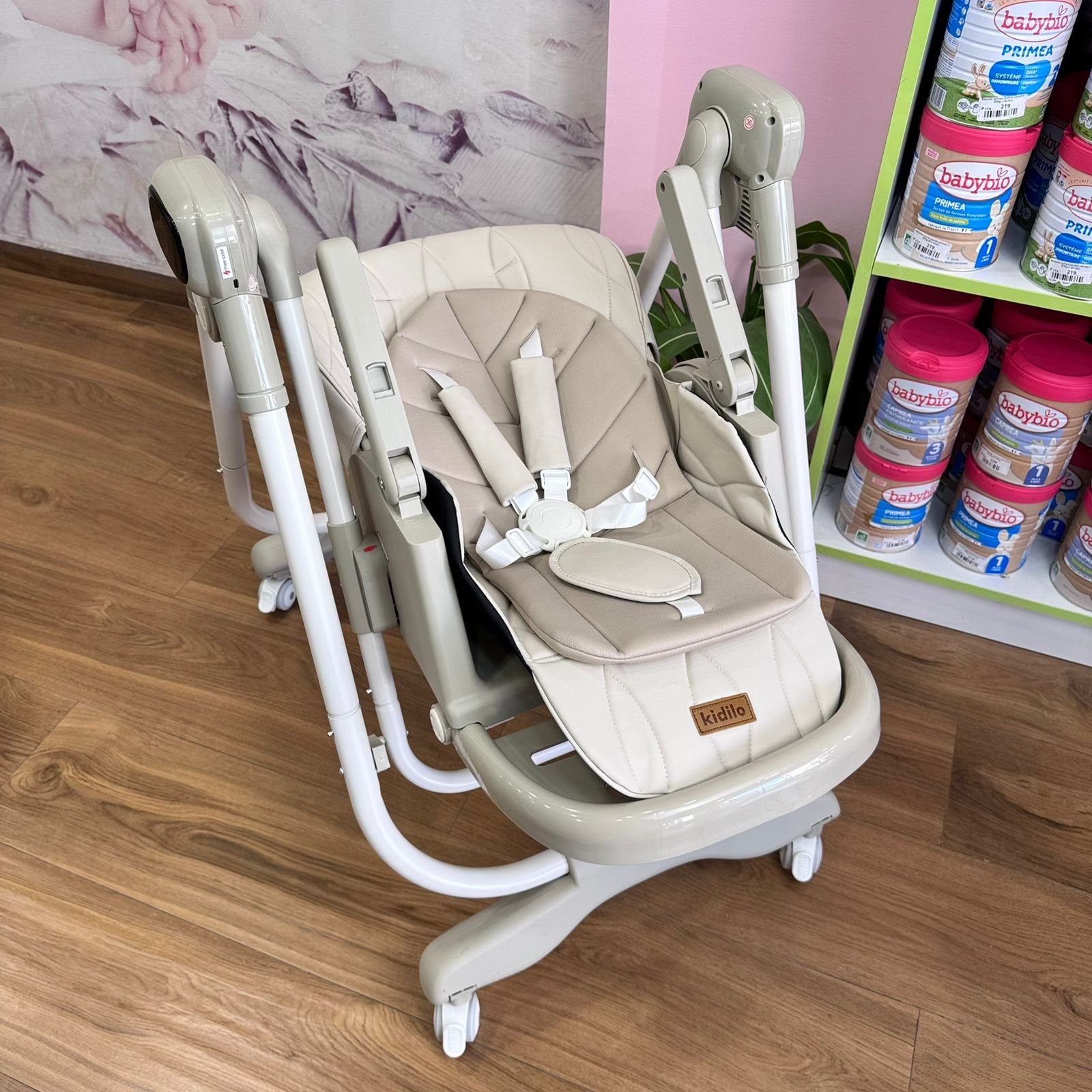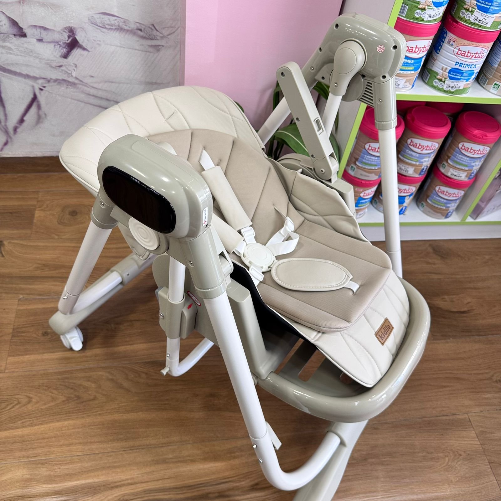 La chaise haute balancelle électrique 2 en 1 Kidilo KD002 combine un siège repas multiposition et une balancelle à balancement électrique avec musiques intégrées. Structure robuste avec 4 roues à freins, ceinture de sécurité 5 points et revêtement en cuir facile à nettoyer. Coussin double en coton doux pour la peau sensible de bébé. Réglages via boutons latéraux et télécommande. Pliable pour un rangement compact. De la naissance à environ 4 ans (jusqu’à 9 kg en mode balancelle).