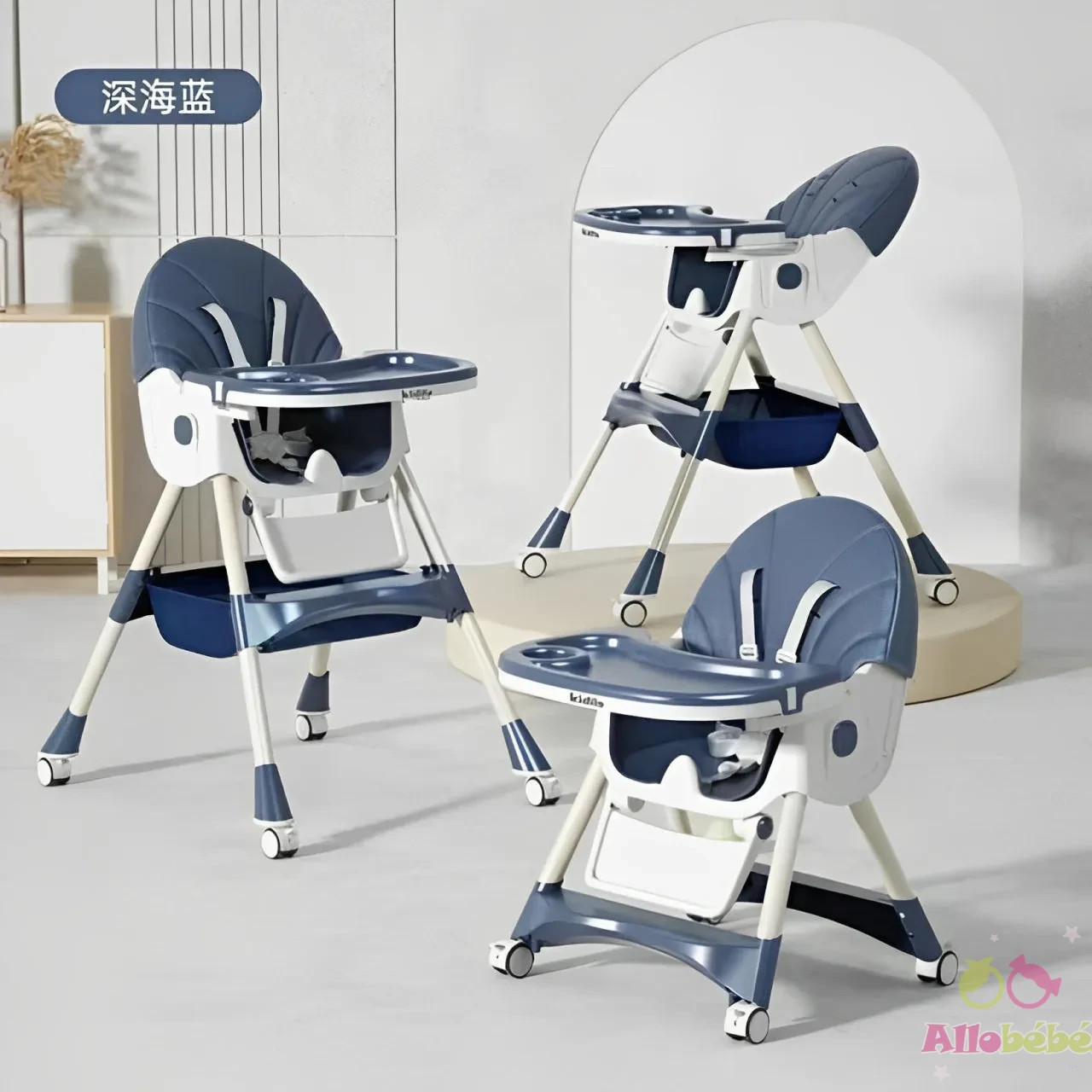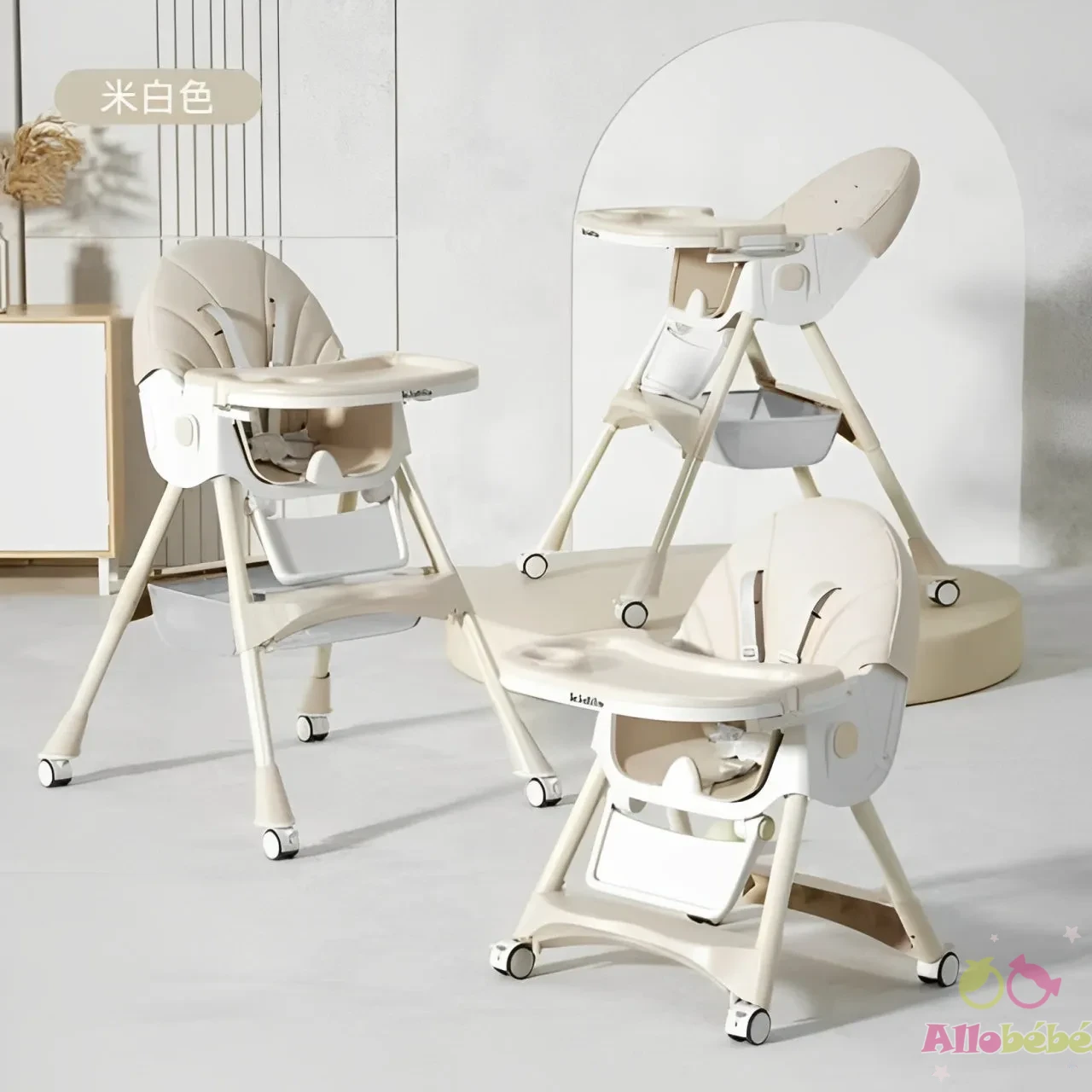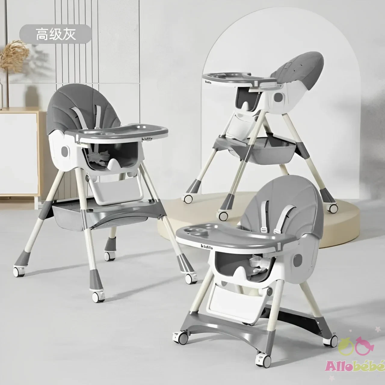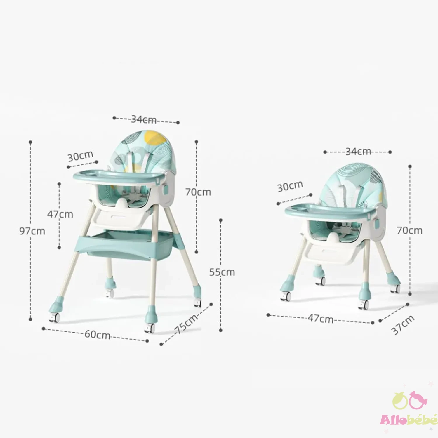 Version chaise haute : 97 × 60 × 75 cm