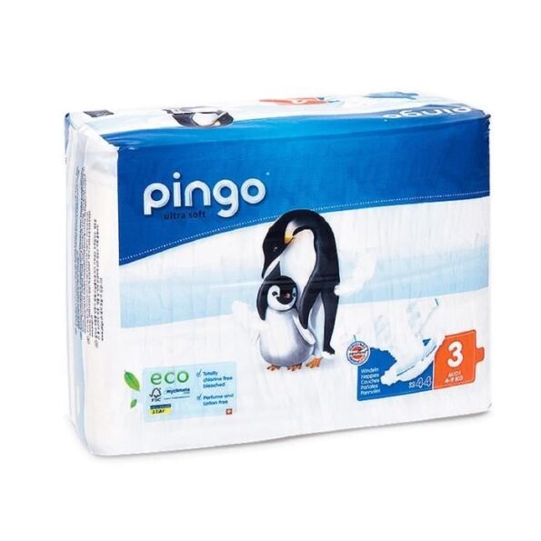 Pingo,la couche éco-responsable pour notre planète et douce pour la peau de bébé ! Pingo Couches écologiques réspirantes aille 3 – 4 à 9 kg – 44 couches. Avec indicateur d’urine.