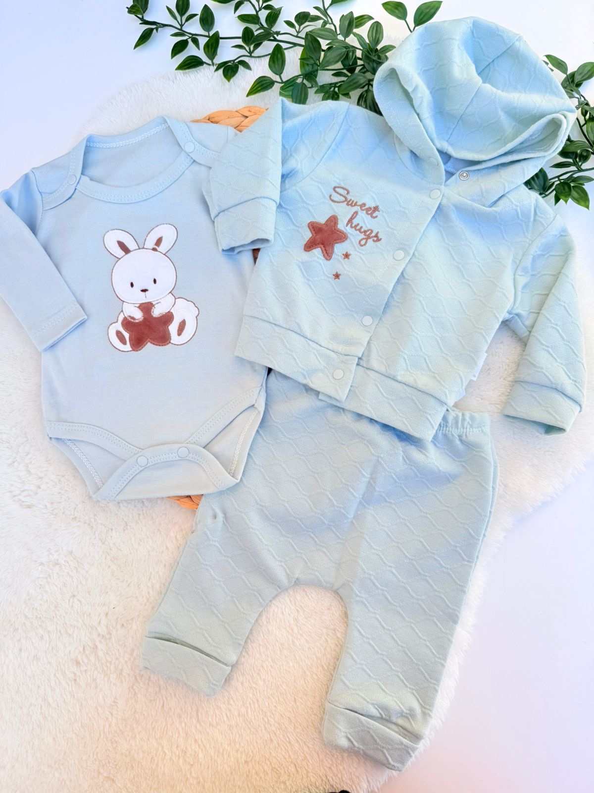 Offrez à votre enfant un cocon de tendresse avec cet ensemble jogging bébé 3 pièces au cardigan brodé. Spécialement conçu pour les bébés de 3 à 9 mois, ce modèle unisexe s’adapte à toutes les saisons grâce à son tissage en 100% coton respirant. Alliant le confort d’un jogging à l’élégance de broderies d’étoiles et d’oursons, cet ensemble polyvalent est la tenue idéale pour accompagner les journées d’éveil et de repos de votre petit trésor.