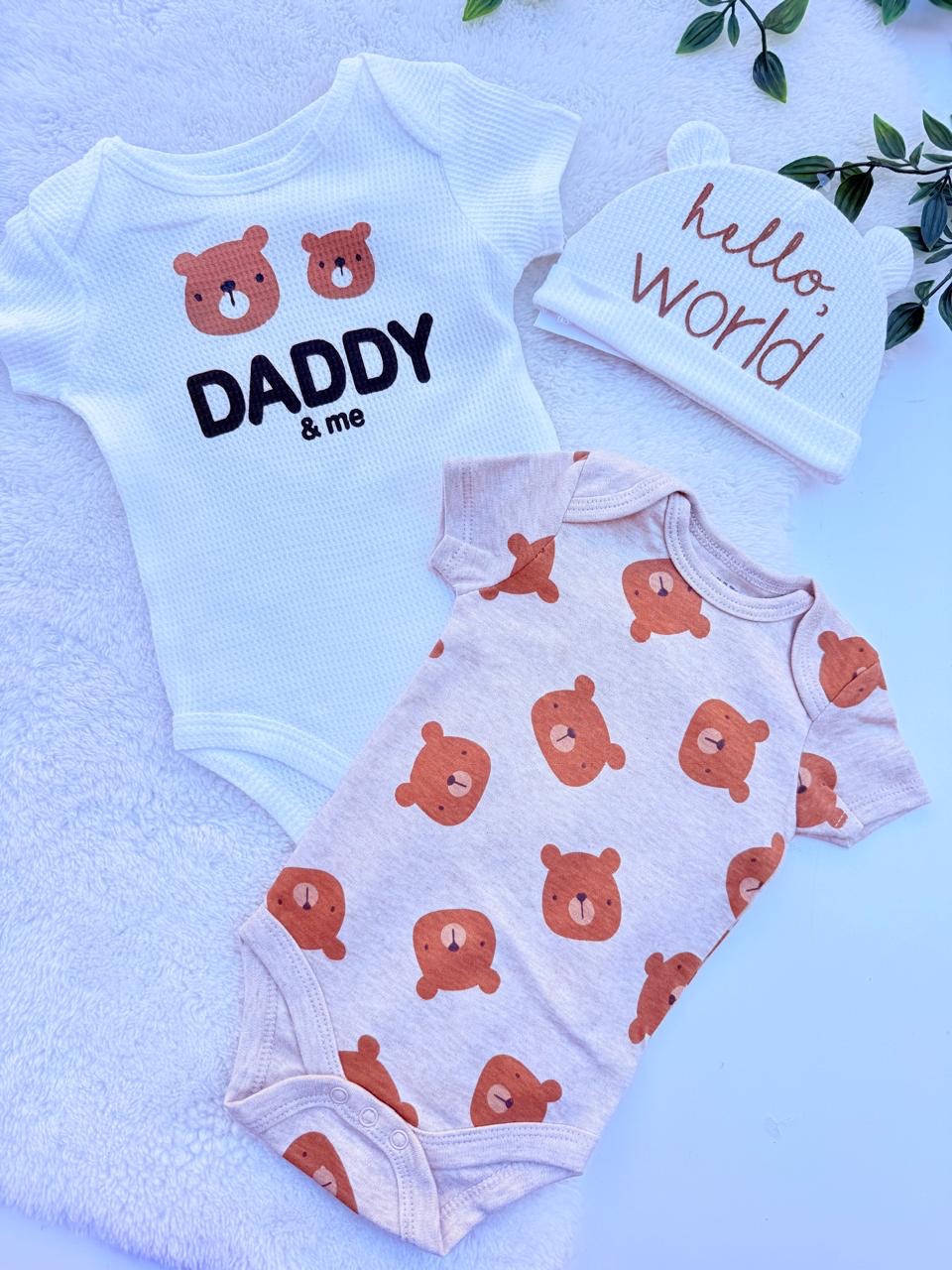 Célébrez le lien unique entre un père et son enfant avec ce lot de deux bodies bébé “Teddy Bear Daddy & Me”, accompagné de son bonnet de naissance assorti. Conçu intégralement en 100% coton pur, ce coffret allie tendresse et confort absolu pour les premiers jours de bébé. Avec ses motifs d’oursons craquants et ses messages affectueux, cet ensemble est le choix idéal pour une arrivée en douceur, garantissant une protection “skin-friendly” et un style irrésistible.