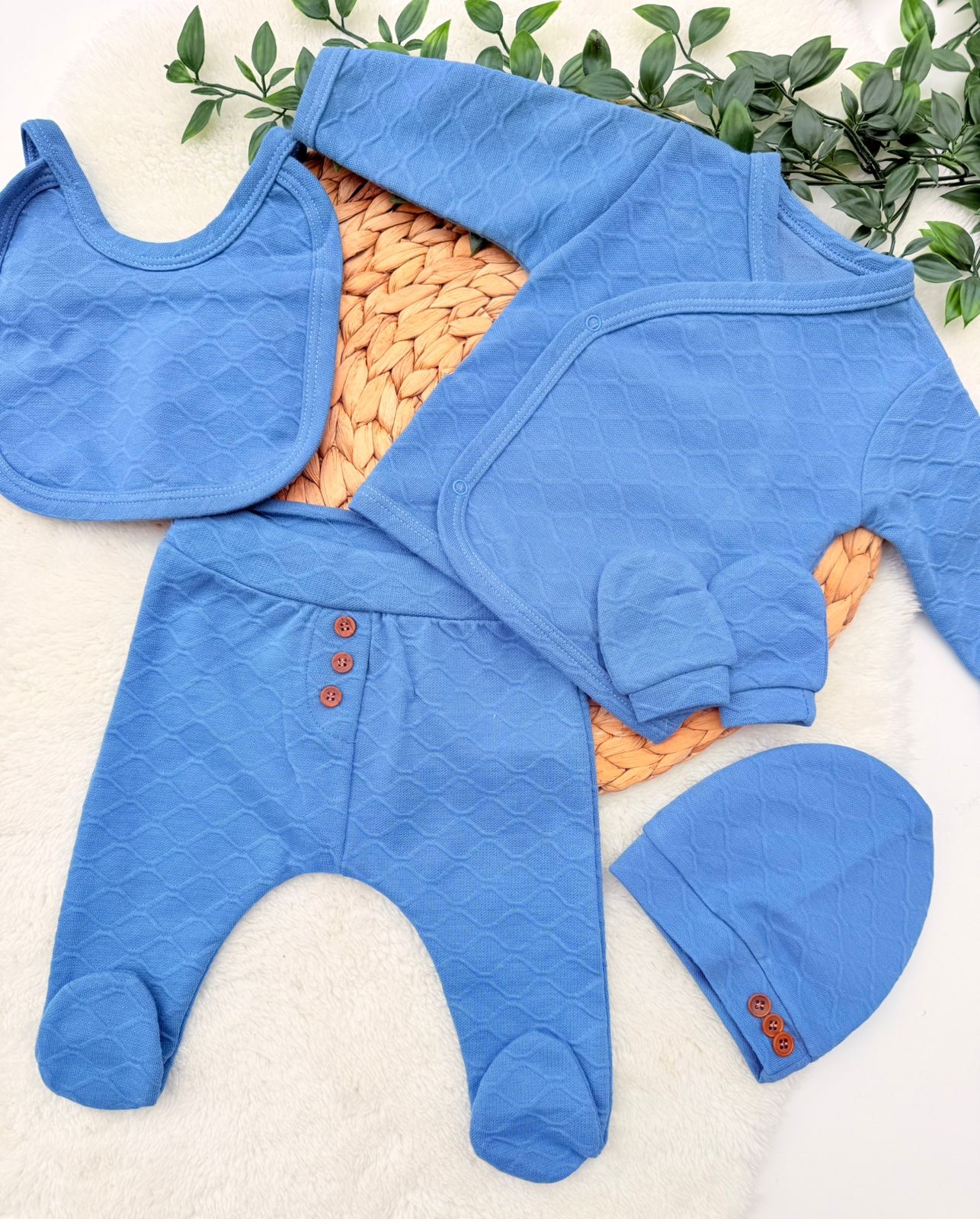 Accueillez votre nouveau-né avec ce pack naissance 5 pièces, conçu pour offrir un équilibre thermique parfait en toute saison. Grâce à sa matière respirante de haute qualité, cet ensemble assure une circulation de l’air optimale tout en maintenant la chaleur nécessaire aux premiers jours. Comprenant une brassière à ouverture facile, un pantalon souple, un bonnet, des moufles et un bavoir assorti, ce trousseau est l’allié idéal de la naissance jusqu’à 6 mois pour un bébé toujours au sec et bien au chaud.