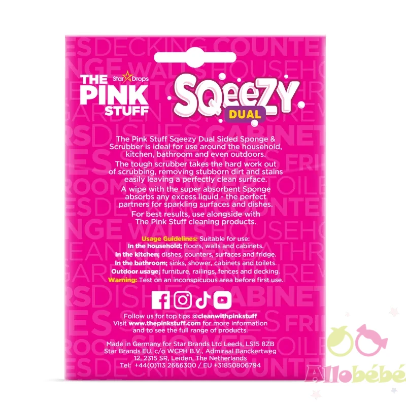 Pour des résultats optimaux, associez l’Éponge Sqeezy Dual avec la Pâte Miracle The Pink Stuff. Ensemble, ils forment un duo imbattable contre la saleté, les taches et les résidus tenaces ! 🌟