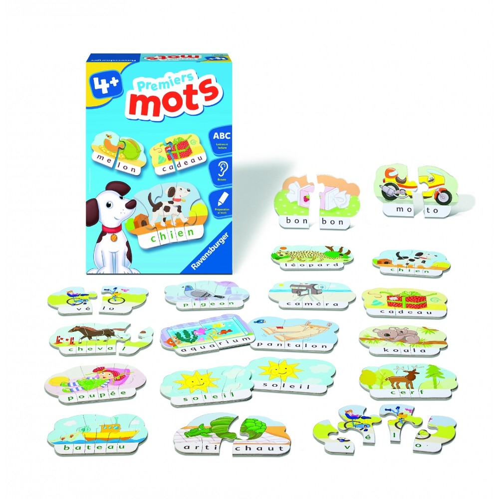 Premiers mots, jeu Ravensburger qui va permettre à l’enfant de s’amuser à composer des mots en syllabes et en lettres. Combien de syllabes forment le mot «maison» ? Quelles lettres forment le mot «fleur» ? Coffret contenant 40 mots puzzle et 1 notice.