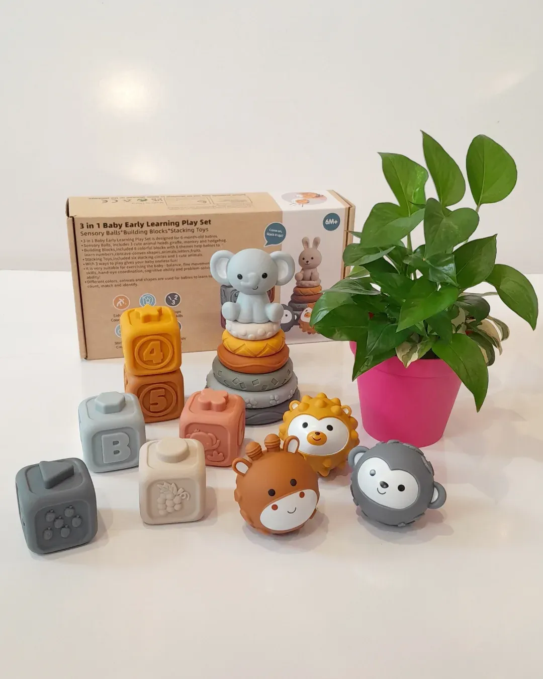 | Composition du Set | Balles sensorielles, Cubes empilables, Tour d’anneaux |