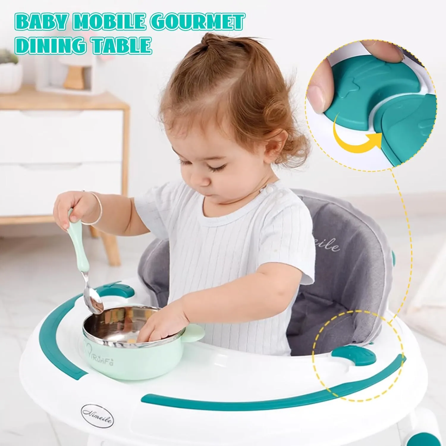 - Avec l’aide de la roue rotative, le bébé peut facilement naviguer.